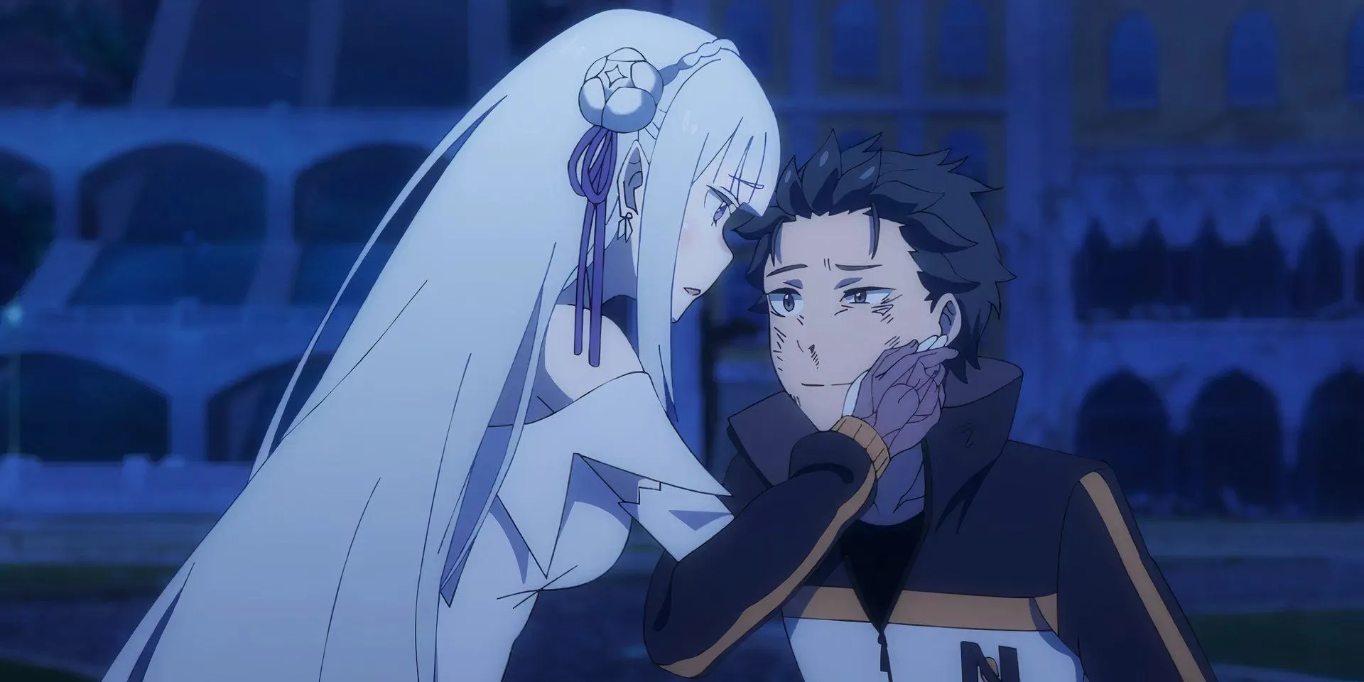 Эмилия обрабатывает раны Субару в аниме «Re:Zero»